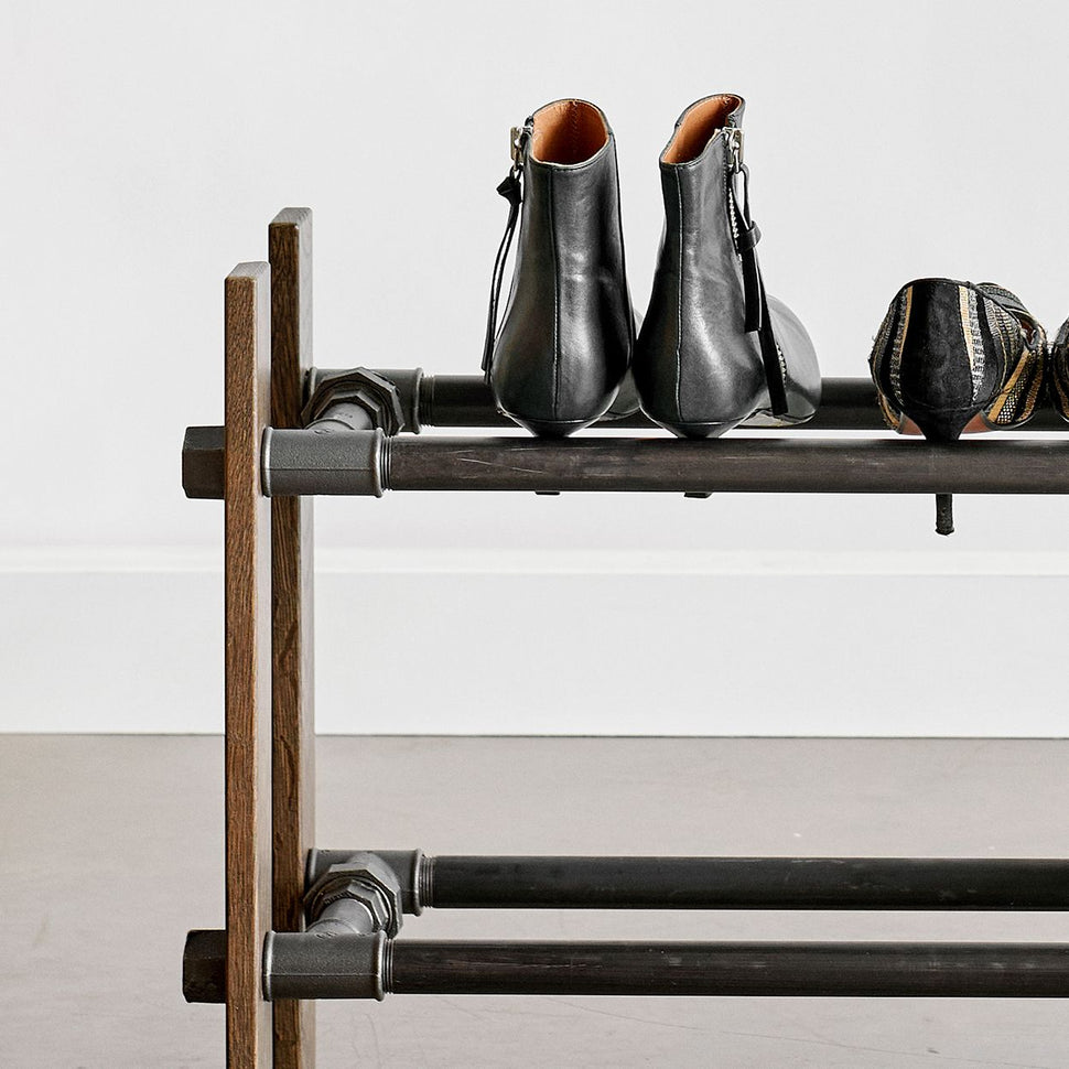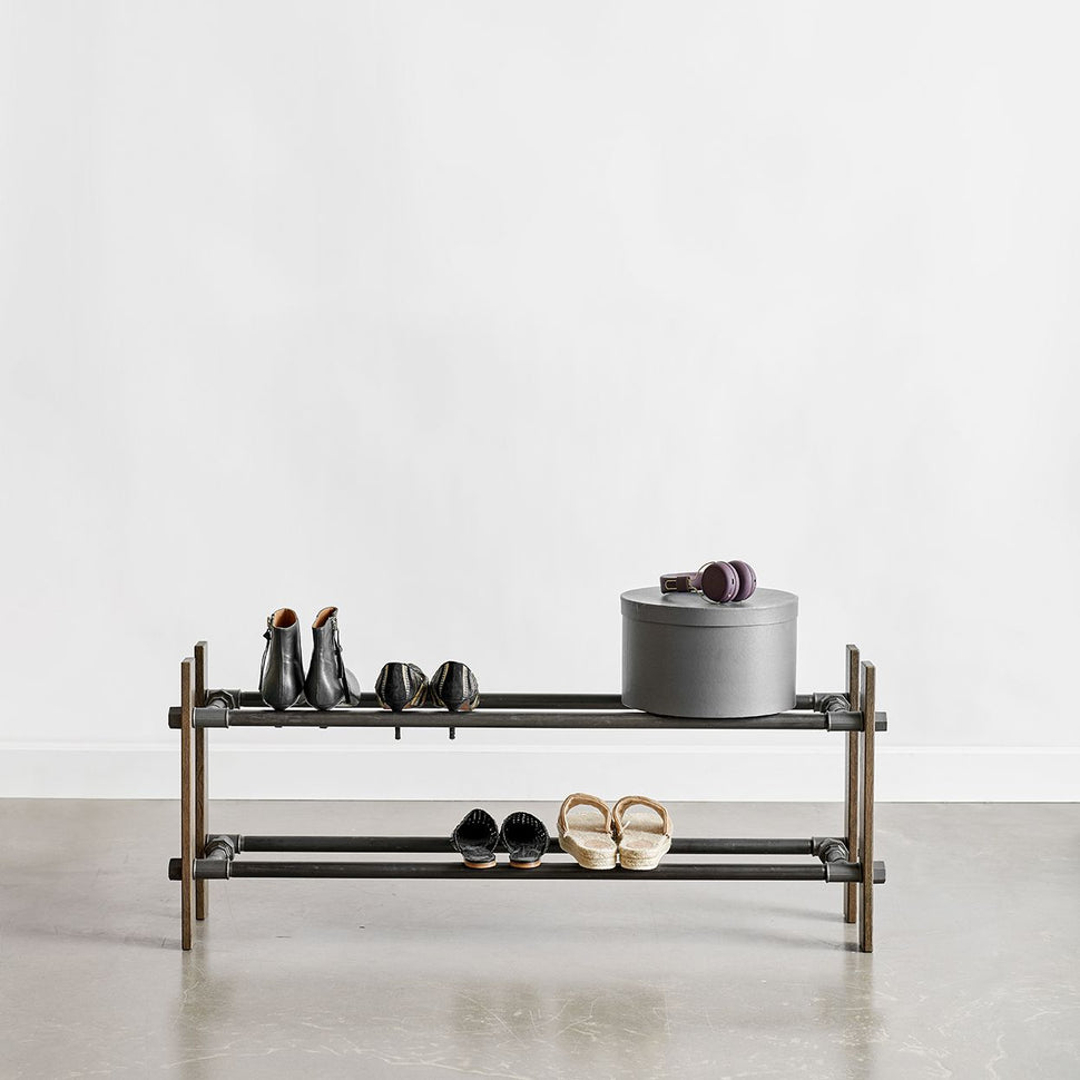 Med en robust ram i rökt ek kombinerat med industriellt inspirerade vattenrör, finns både i mörka och galvaniserade utföranden, sätter vår skohylla en ny standard för både estetik och funktionalitet. Du kan visa upp allt från sneakers till stilettos, och hyllan passar oavsett om du inreder din korridor, walk-in closet eller garderob.