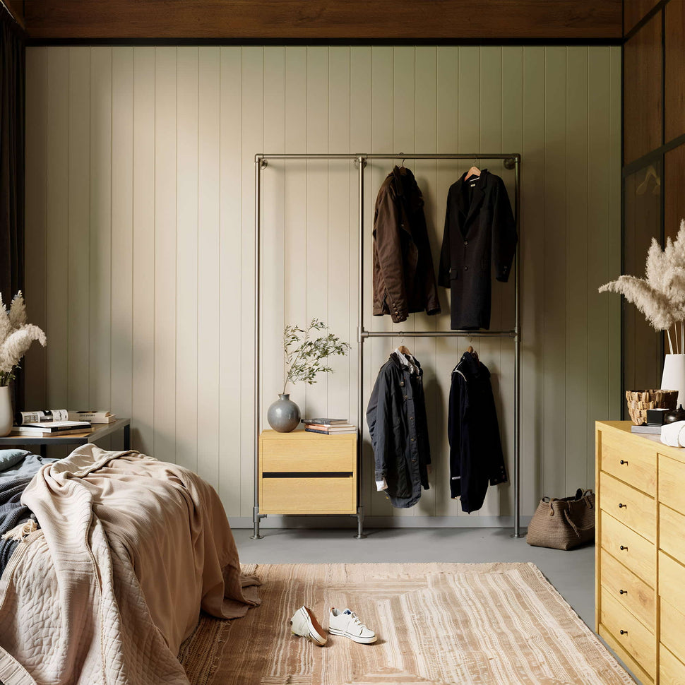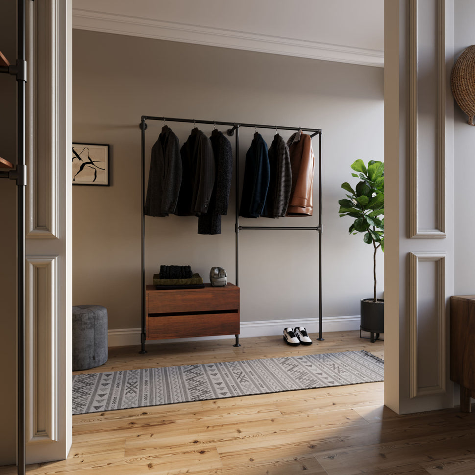 Välkommen till The Walk-In förvaringssystem med 2 sektioner och byrå - (1 stång + byrå / 2 stänger)