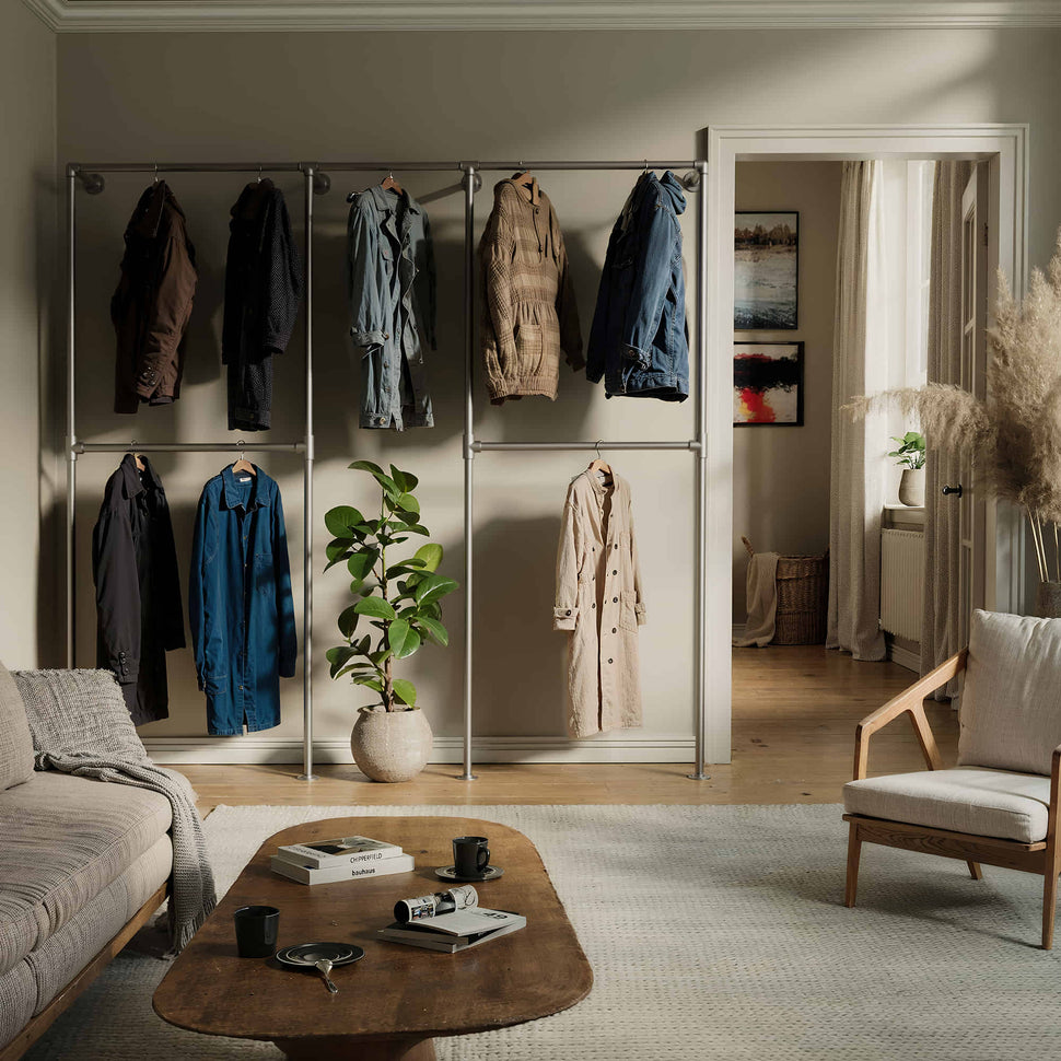 Som ett designföretag med danskt ursprung är vi på RackBuddy passionerade när det gäller att erbjuda hållbara, prisvärda och skräddarsydda lösningar. Vår The Walk-In klädställning med 3 sektioner - (2 stänger / 1 stång / 2 stänger) är framtagen med din vardag i åtanke – oavsett om du är en kreativ professionell eller en familj med små barn som prioriterar både stil och funktion. Vår lösning är inte bara en investering i din förvaring, utan också en satsning på en livslång partner som sträcker ditt utrymme till nya möjligheter.
