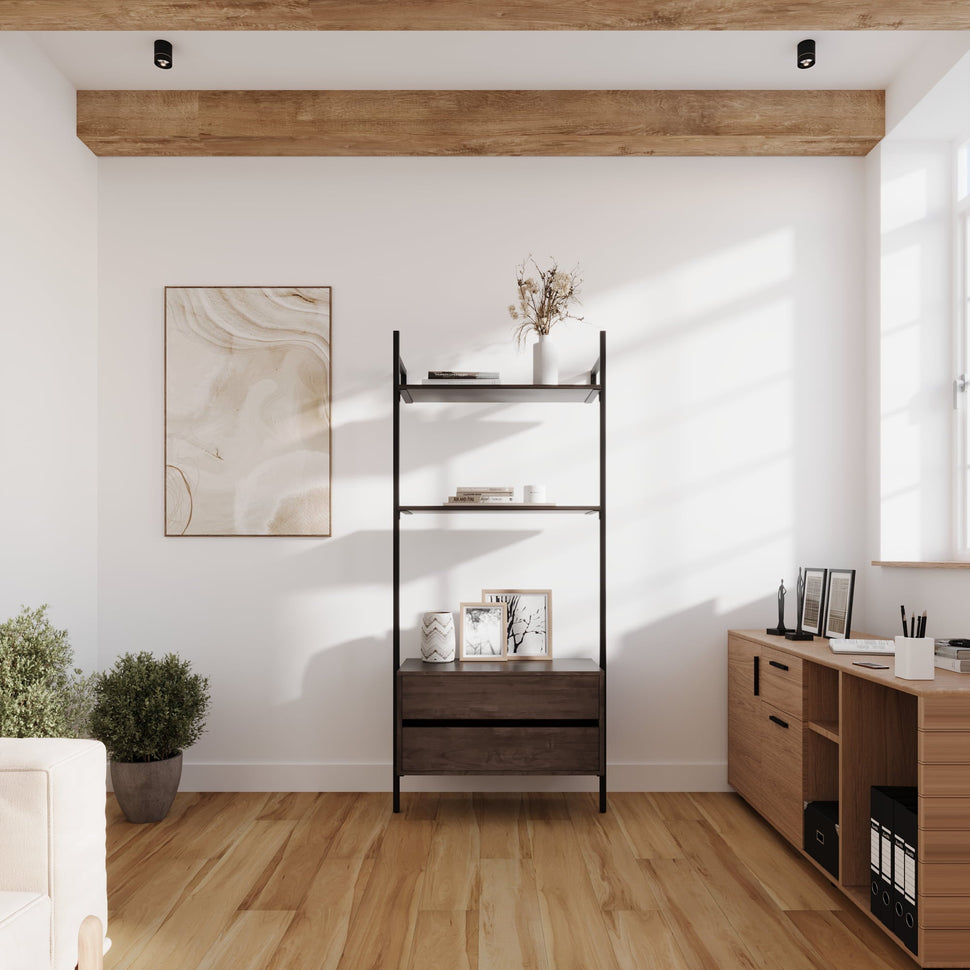 Välj mellan en ljusare, klassisk ekfanér och en mörkare, rökt variant att kombinera med hyllkonsoler i mattsvart.