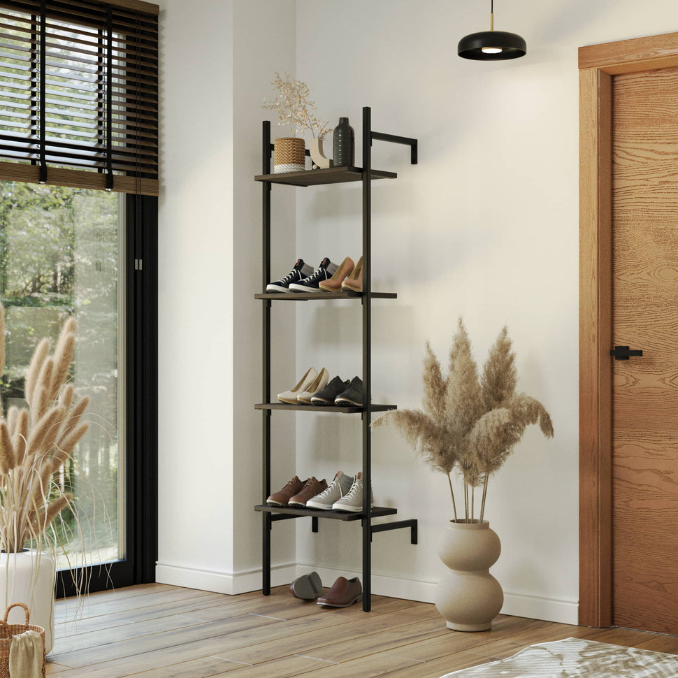 Denna variant på förvaringssystem i Frame-design består av en sektion med fyra stycken ekhyllor som kan justeras i höjdled. Om du saknar plats för din kollektion av skor eller behöver förvaring åt alla dina böcker så är det här den rätta förvaringslösningen för dig. Den passar lika bra i sovrummet, vardagsrummet och varför inte i köket för att förvara alla kryddor eller tallrikar. Ett annat sätt att använda garderobssystemet är att kombinera det med andra varianter från vår Frame Walk-In Collection och förvandla ett extrarum till en walk-in-closet.