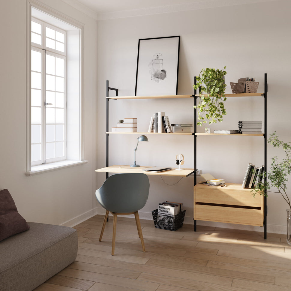 Den nätta lösningen med två sektioner får du plats med i de flesta utrymmena. Här kombineras arbetsyta med förvaringsplats på samma kvadratmeter. Du kan dessutom anpassa förvaringslösningen helt efter dina preferenser och behov. Hyllorna, byrån och skrivbordet kan du höja och sänka som du vill.