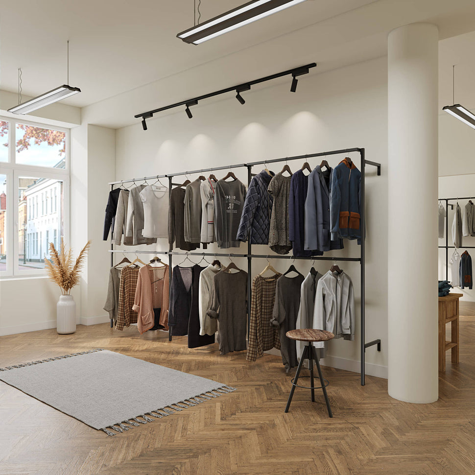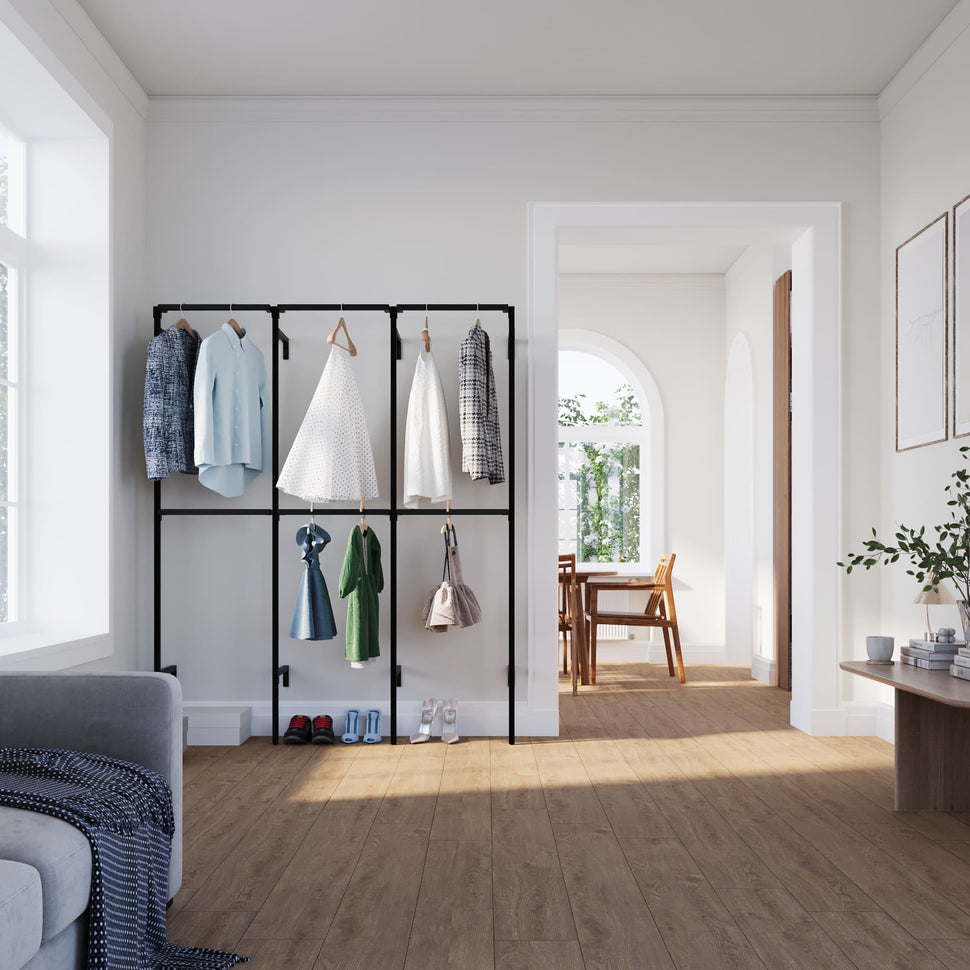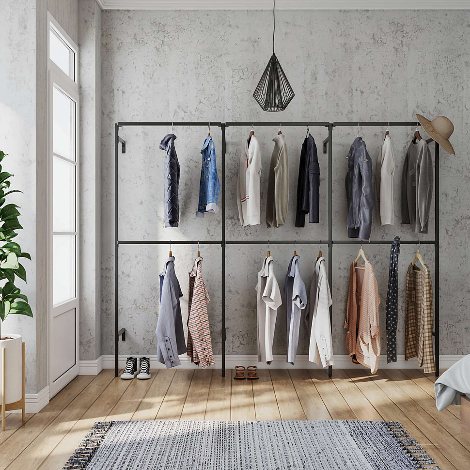 Skapa en personlig walk-in-closet med denna öppna garderobsdesign. Klädställningen har 3 sektioner som har 2 parallella klädstänger vardera. Det ger dig gott om förvaringsutrymme åt skjortor, blusar, tröjor, byxor, kjolar, etc. Om du behöver mer plats eller annan typ av förvaring är det enkelt att kombinera denna modell med någon av våra andra garderobssystem från vår Frame Walk-in Collection. Du hittar modeller med trähyllor och byråer där du kan förvara allt från underkläder och väskor till handdukar och lakan. Genom att mixa och matcha kan du skapa en unik förvaringslösning som passar perfekt in i ditt hem.