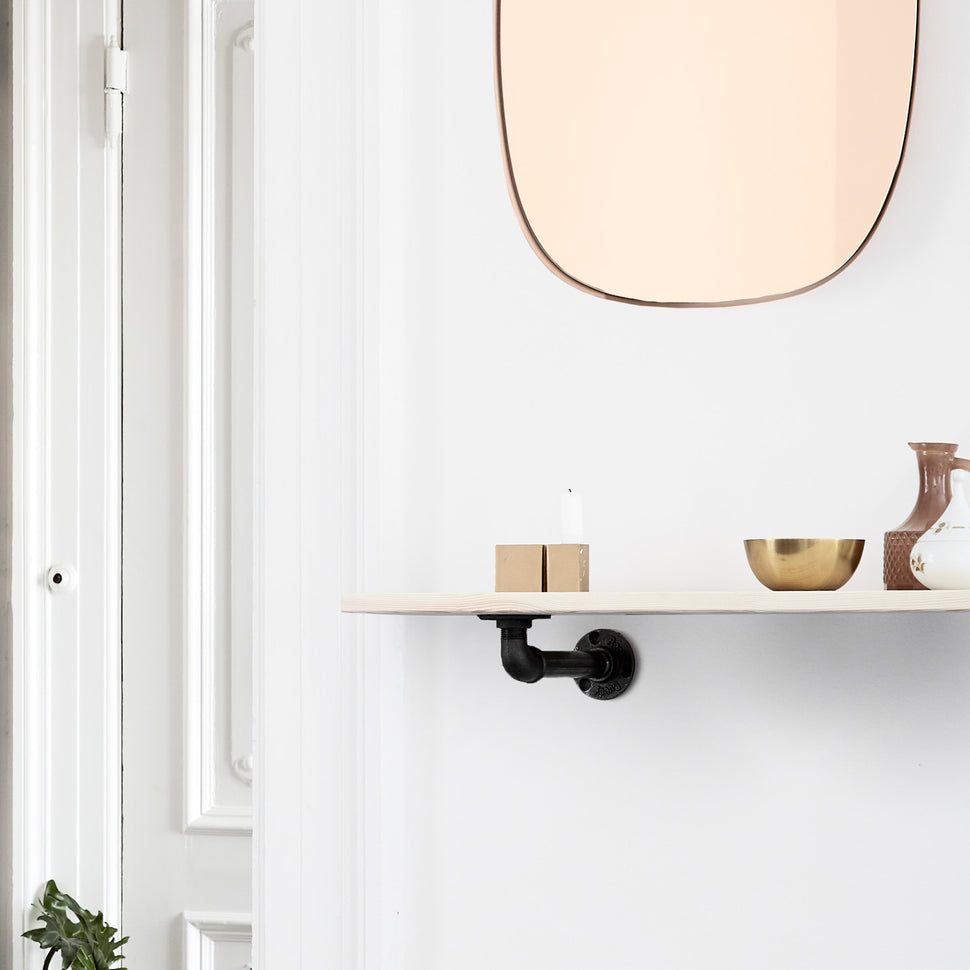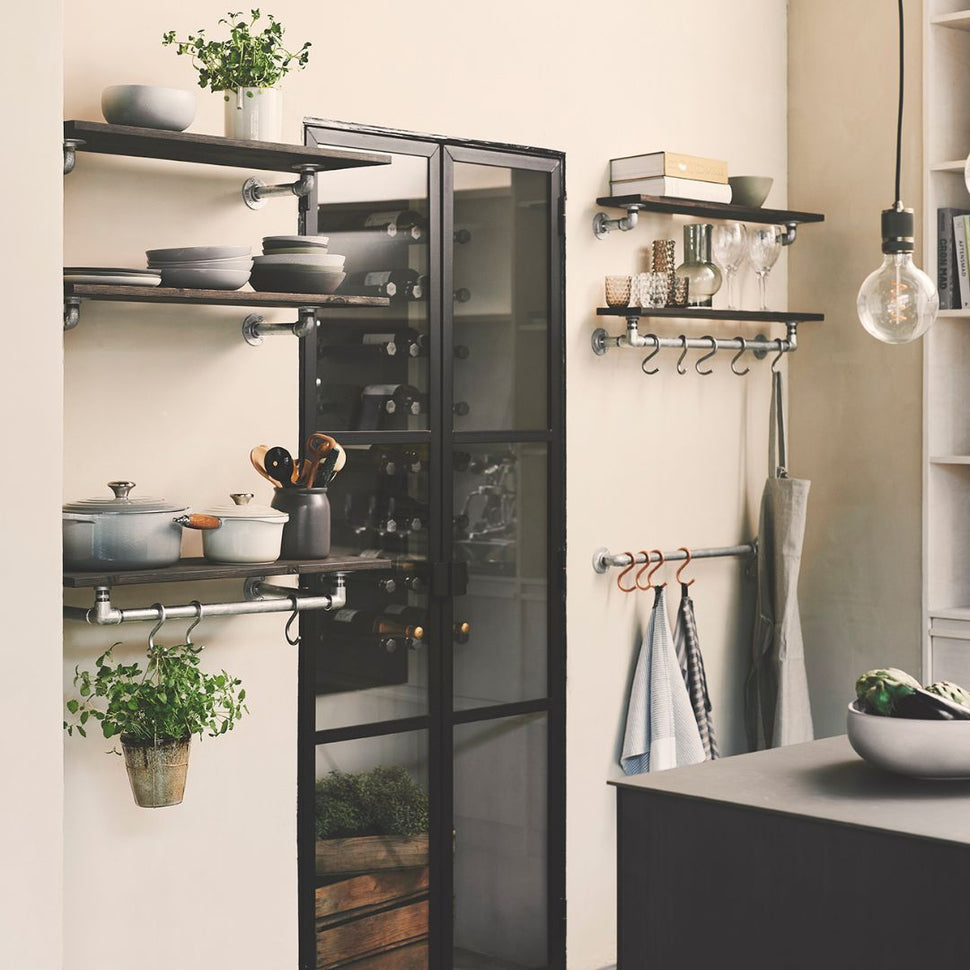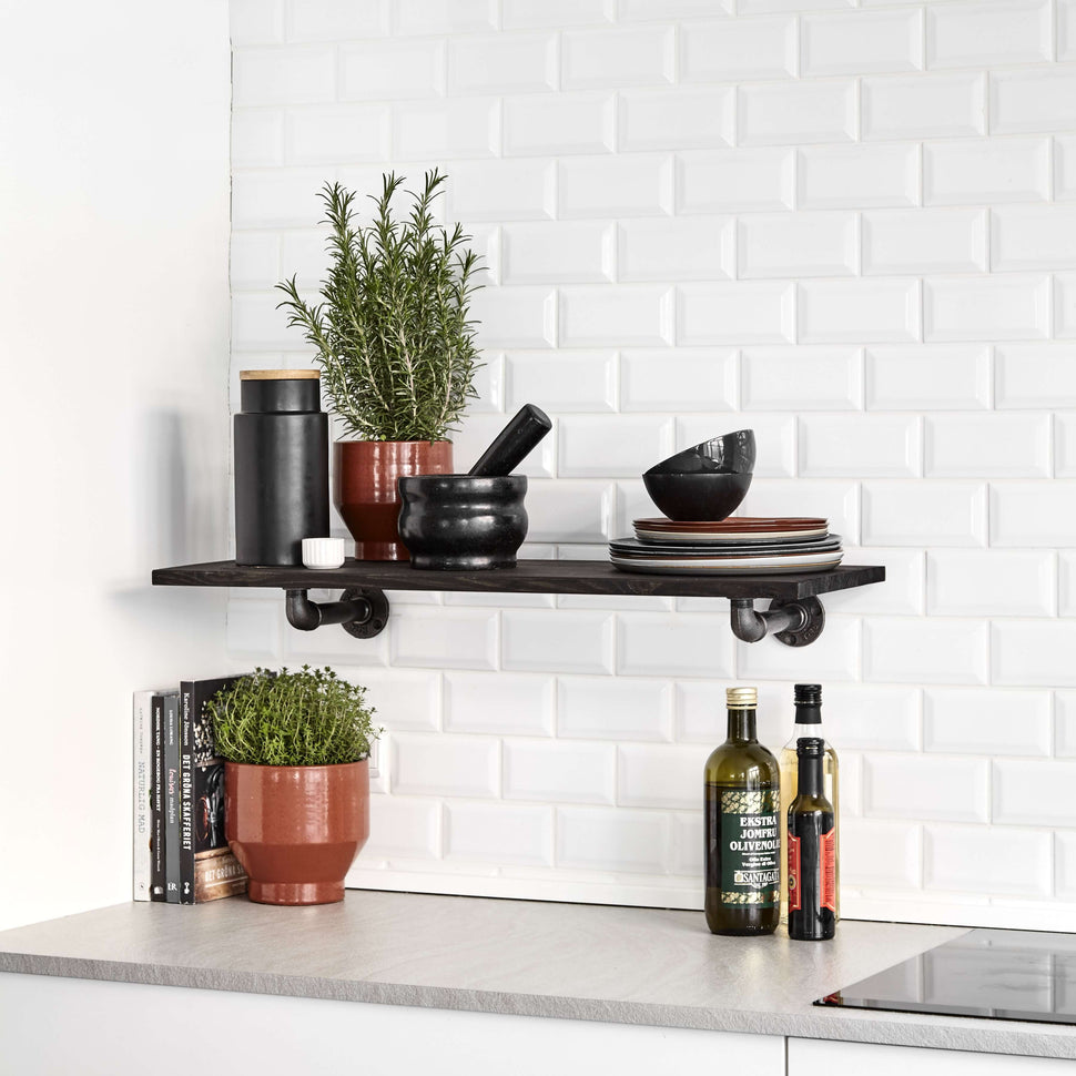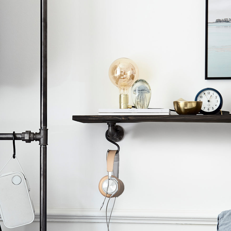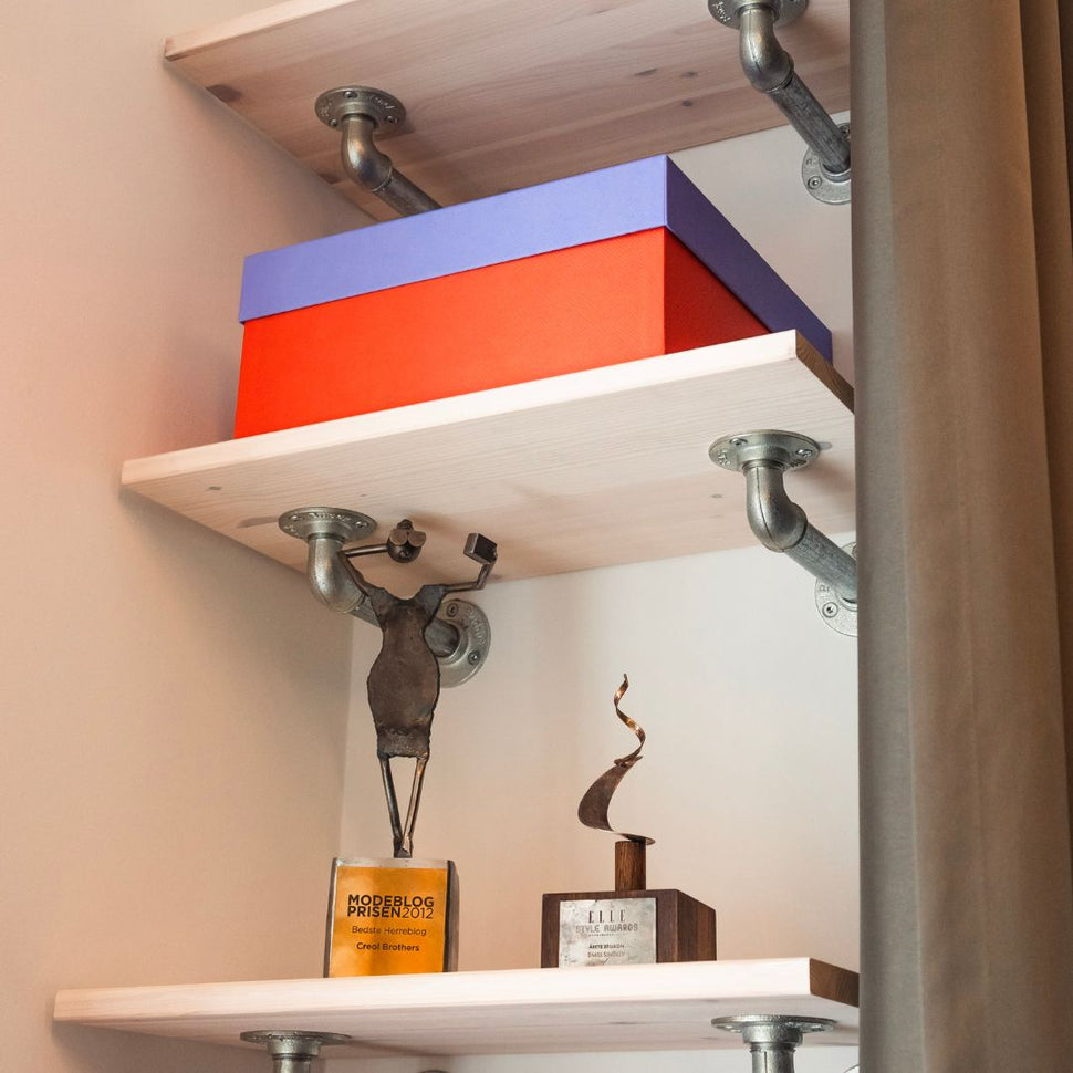Transformativ design: Kombinationen av trä och vattenrör (silverlackerade eller mörka) ger hyllan ett unikt och industriellt uttryck som lyfter vilken inredning som helst.
